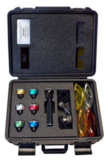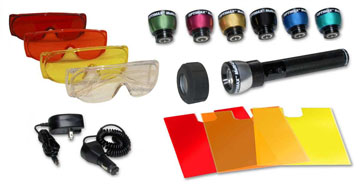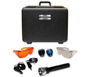 多波段警用檢查光源配有結(jié)實(shí)的黑色陽化鋁手電殼體、七個可快速更換的LED燈頭(UV-A(長波紫外)、藍(lán)光、藍(lán)綠光、綠光、琥珀光及白光)、三個插入式濾色板(黃色、橙色及紅色)、交流及直流充電器、四個眼鏡(紫外防護(hù)、橙色、黃色及紅色眼鏡)及一個手提箱。