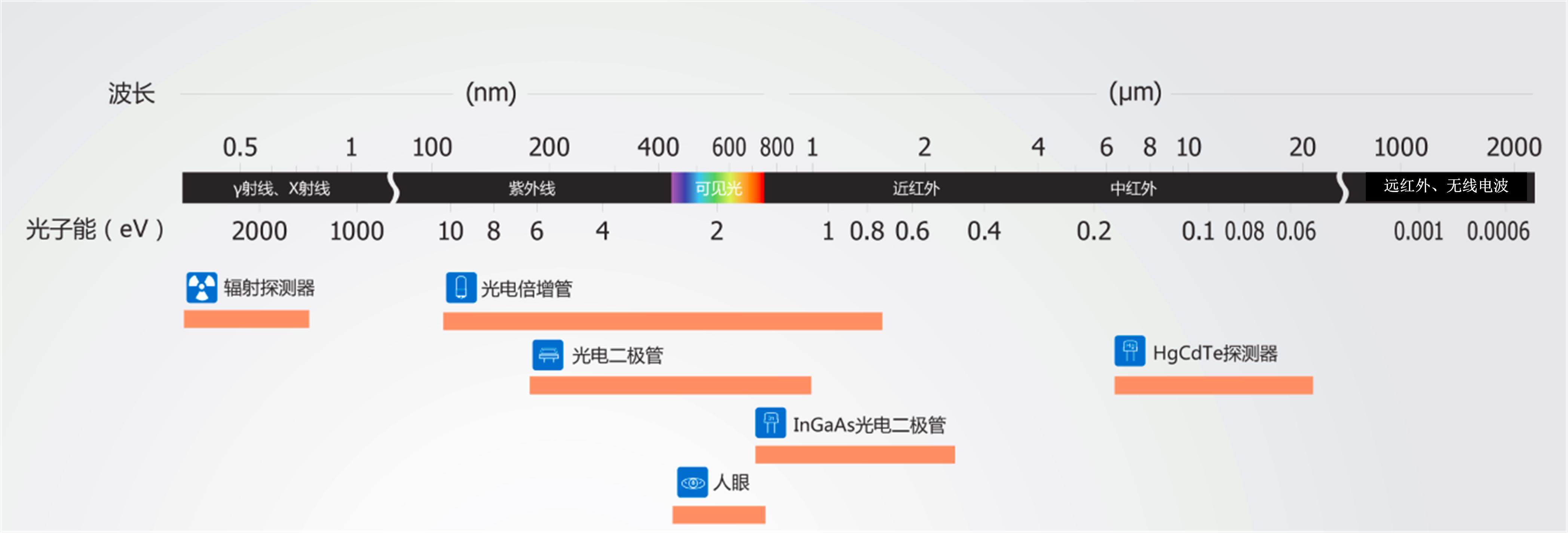 光電倍增管(Photomultiplier Tube,簡稱PMT)是一種真空玻璃器件,可將光信號轉(zhuǎn)化為電信號,因超高靈敏度和快速響應(yīng)等特點備受關(guān)注。在檢測光譜方面,其可探測約100nm~1μm范圍內(nèi)的光信號。此外,在更短波方向,如γ射線、X射線探測使用的輻射探測器,以通過各種閃爍體轉(zhuǎn)化成可見光,然后再通過PMT進行檢測,其關(guān)鍵器件也是PMT。