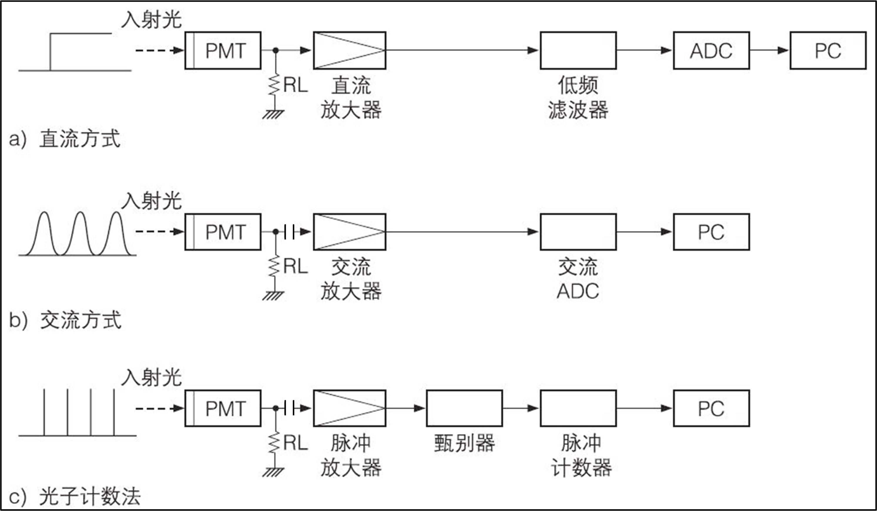 PMT連接分壓器和高壓便可從陽輸出電流信號,后續(xù)連接回路的設(shè)計根據(jù)入射光強的不同而有所區(qū)別,如圖5所示,其中a)直流方式,是將PMT的直流成分分別通過放大器、低通濾波器之后再進行檢測,該方法適用于探測光強相對較強的情況,且使用較為廣泛;b)交流方式,是將PMT的輸出通過電容器取其交流成分,再用平方檢波器將其變成直流成分進行檢測,該方法一般適用于光強較弱的情況,在此情況下,輸出信號中的交流成分壓制了直流成分而占主導(dǎo)地位;c)光子計數(shù)方式,是將PMT的輸出脈沖先放大,再經(jīng)過脈沖幅度甄別器進行選擇,然后對幅度在某一甄別電壓之上的脈沖進行計數(shù),該方法適用于觀察從PMT輸出的脈沖是離散的情況,因此其在微弱光探測領(lǐng)域即單光子領(lǐng)域是一種非常有效的方法。