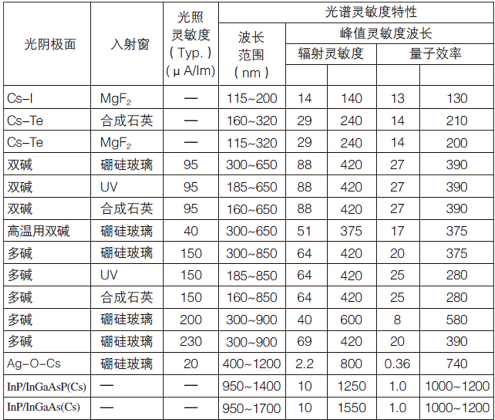 雖然PMT可探測光譜范圍很寬,但每一種管型可直接響應(yīng)的波段范圍是有限的,為使其探測效率得到充分利用,同時又不造成性能及成本的浪費,需要根據(jù)入射光的波長選擇合適波段的PMT,如圖1所示。