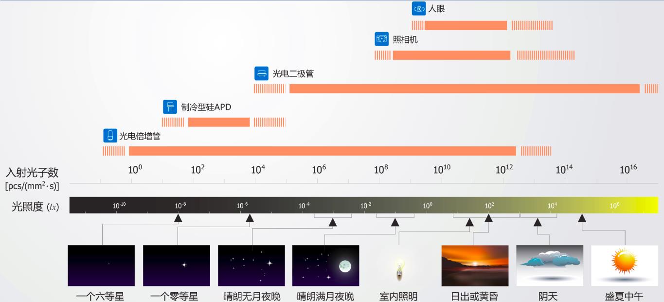 PMT是微弱光探測的利器,根據(jù)入射光強大小及后續(xù)電路處理方法的不同,可分為模擬用PMT(常規(guī)型號PMT)和光子計數(shù)用PMT(型號后綴帶“P”標識)。前者可探測10-11W~nW量級的光強,后者可探測10-16W~10-11W量級的光強,二者在10-11W量級光強范圍存在交疊部分,需根據(jù)實際應(yīng)用及入射光其他特性具體分析哪種更加適合。