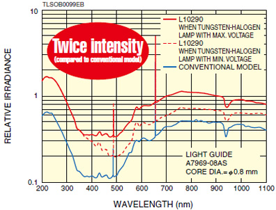 通過使用安裝在同一外殼內(nèi)的高亮度氘燈和鹵鎢燈,該光源能通過光波導(dǎo)(單賣)輸出200nm到1600nm的光。輸出的光強大約是現(xiàn)有型號的兩倍。緊湊的尺寸和較輕的重量使其易于攜帶。機械快門和外部控制等實用的功能使其易于使用。這種新型光源同時適用于多種型號的便攜式設(shè)備。