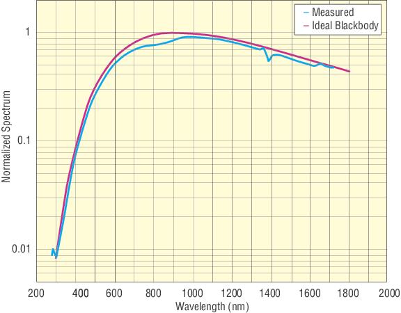 The Light Source THL100 uses the 6001 100 W TH lamp as its illumination source. This Tungsten Halogen lamp exhibit better output stability than arc lamps and do not produce strong UV light emission or toxic ozone. Their smooth spectral output curve make them useful for radiometric and photometric applications.