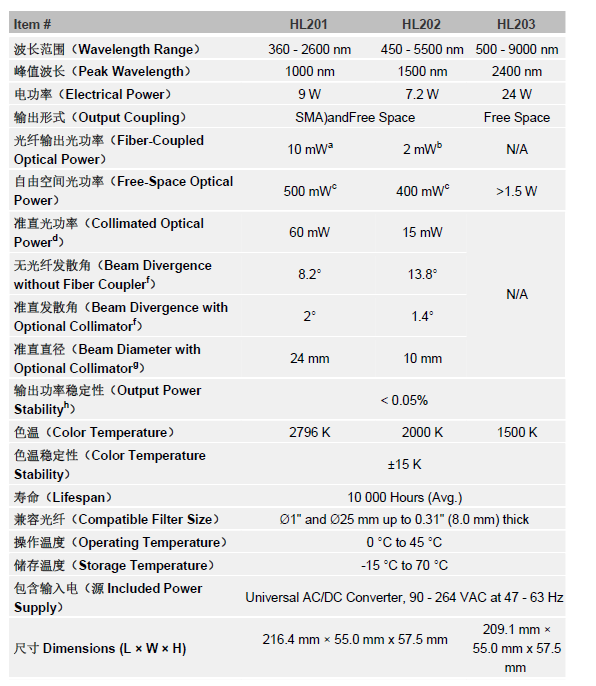 所有光源型號都有一個集成濾光片支架,其中HL201 和HL202 提供用于光纖輸出的SMA 接頭,而HL203為自由空間輸出。光纖耦合光源上的光纖耦合封裝能被準(zhǔn)直封裝(分開出售)代替,快速釋放裝置用于安裝光纖耦合封裝,以保證在代替光纖耦合封裝時保持耦合效率。通過對定制光學(xué)系統(tǒng)使用SM1QAM 快速釋放轉(zhuǎn)接件,內(nèi)螺紋透鏡套筒也可以直接附加到每個光源前。由于光源尺寸小(請見規(guī)格標(biāo)簽),用戶能夠靈活地放置在擁擠的光學(xué)平臺上。所有光源可以通過底部的兩個M6 螺孔安裝在Ø1 英寸接桿上。