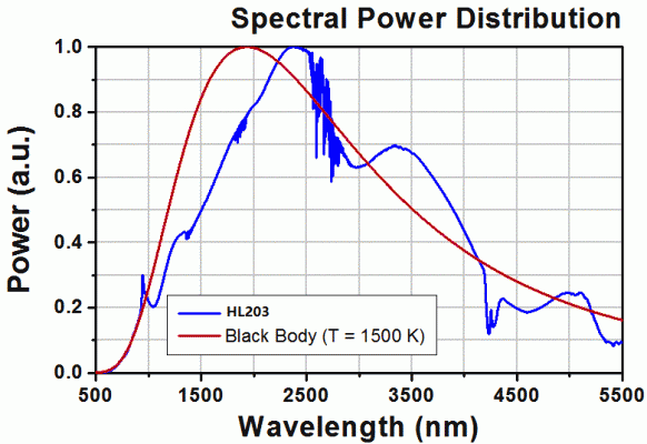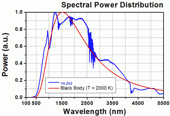 HL203 類鹵鎢燈光源光源具有在500 至9000 nm 間的恒定光強,>1.5 W 的黑體輻射光譜。由于該黑體光譜覆蓋了可見光和中紅外光譜范圍,這個光源是集成到中紅外測量和分析系統(tǒng)的理想選擇。它使用了一個位于橢球反射器內(nèi)的碳化硅棒,以增大光輸出。一個CaF2 透鏡準(zhǔn)直光源發(fā)射的光。包含的自定義濾光片支架加工成匹配光源外殼的高度,并且也經(jīng)過了紅色陽氧化處理。