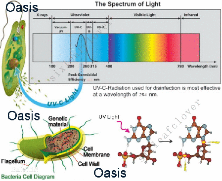 波長在240~280nm范圍內(nèi)的紫外線可以破壞細(xì)菌病毒DNA(脫氧核糖核酸)或RNA(核糖核酸)的分子結(jié)構(gòu),造成生長性細(xì)胞死亡和(或)再生性細(xì)胞死亡,達(dá)到滅菌消毒的效果。尤其是波長為254nm的紫外線,滅菌消毒的效果強(qiáng)且不會(huì)產(chǎn)生臭氧造成二次污染。有待于進(jìn)一步發(fā)展和研究。